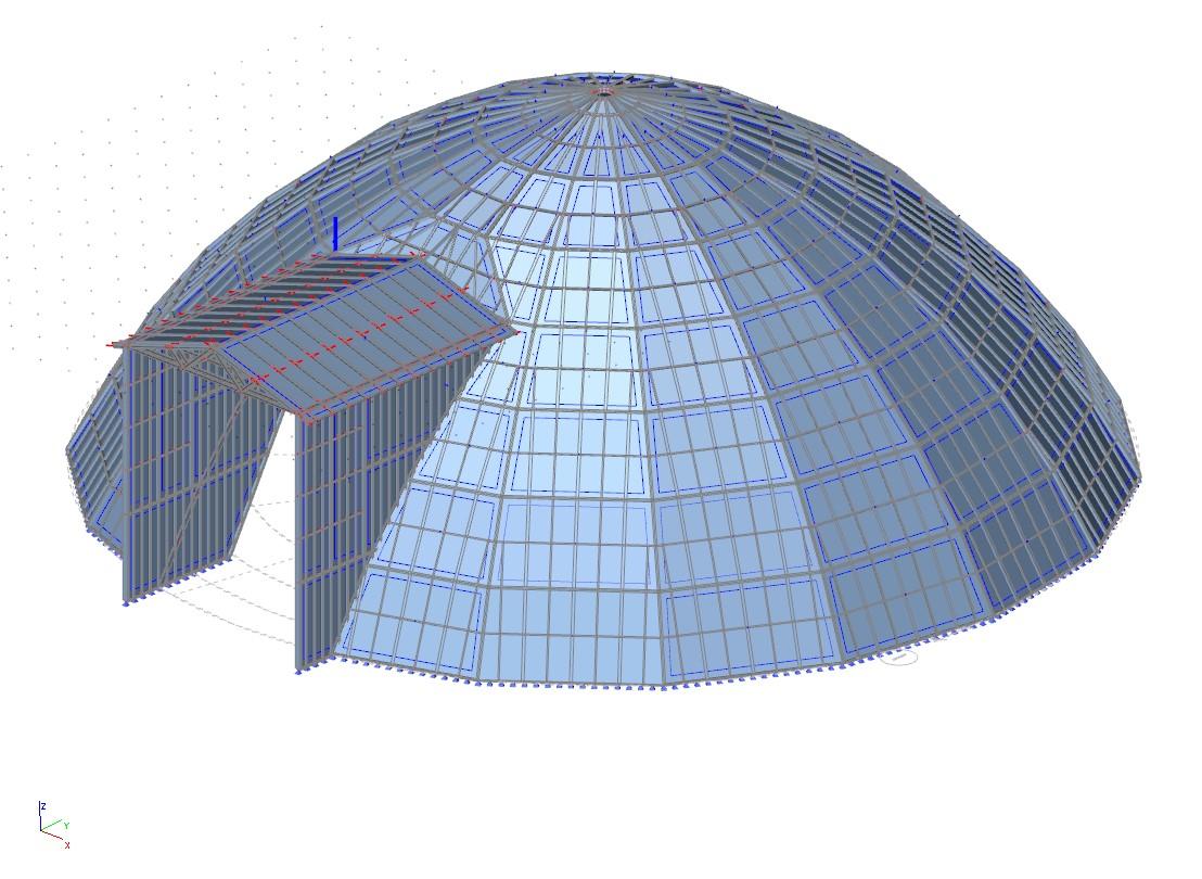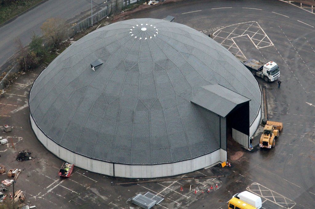 Structurally, the domes use softwood timber and birch ply to form trapezoidal panels containing a lattice of solid timber studs and beams with a glued ply outer skin, which are faceted in layers. These panels are connected using bolts to form a rigid frame that is capable of resisting lateral loads using the diaphragm action from the ply membrane.